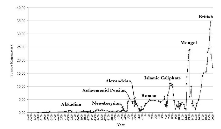 Figure 1. “Rise, fall and upward sweeps as revealed by Taagepera's estimates of the territorial sizes of the largest empires in the Central System”
